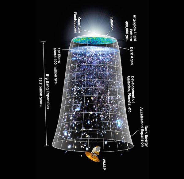 如前面的科學部分所述:2001年 NASA發射了人造衛星WMAP,並在幾年後發表宇宙膨脹時空演化圖表,記錄並介紹給社會大眾認識。這從一開始就膨脹一直到現在的宇宙時空演化圖,並且標記何時發生何事的關鍵性重要事件。這圖表不但堪稱是史上最長久的歷史資料,也記載了宇宙從誕生時期一直到現在大爆炸論所揭開的奧秘。 例如: 眾星如何發生的﹐暗能量如何影響宇宙膨脹等, 實在是值得令人敬佩!